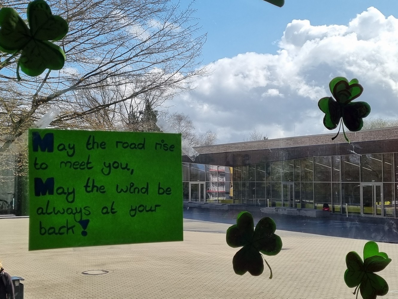 Im Bereich des Haupteingangs nahm die Anzahl an dreiblättrigen Kleeblättern, die mühevoll von den Schülerinnen und Schülern des Ganztags ausgeschnitten und gestaltet wurden, schon seit ein paar Wochen fast täglich zu. Diese Kleeblätter (shamrocks) sind eng mit Irland verbunden, benutzte der heilige Patrick sie einer Sage nach doch als Metapher für seine Missionstätigkeit, um das christliche Prinzip der Dreifaltigkeit zu erklären. Heute ist das Kleeblatt ein beliebtes Nationalsymbol Irlands.