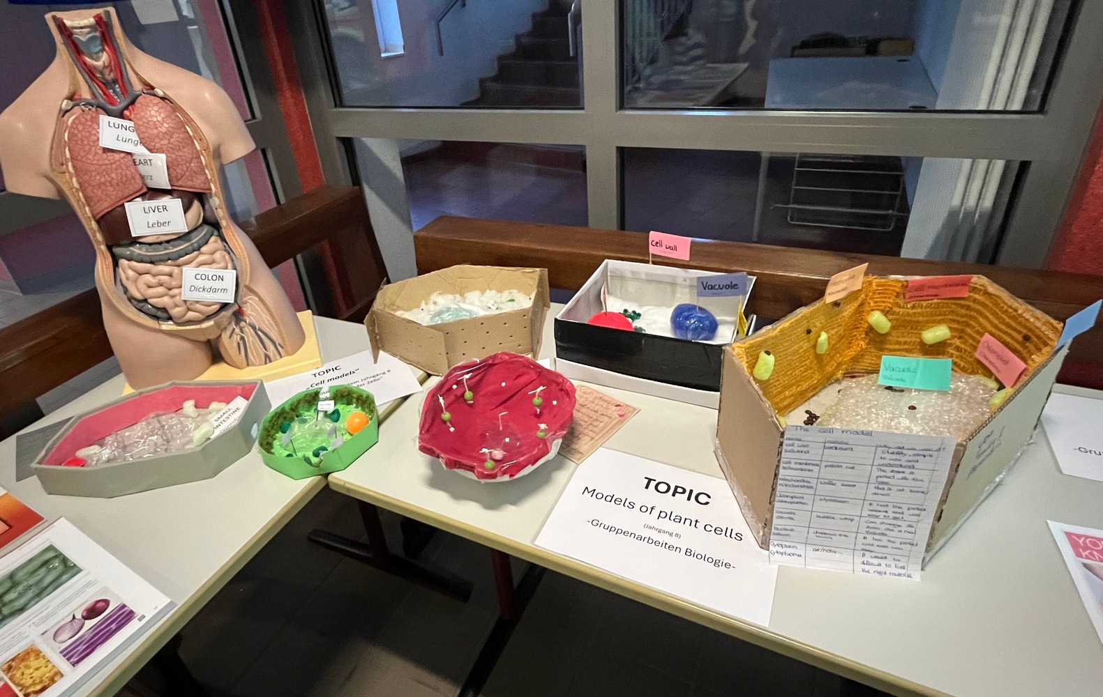 Teilnehmer*innen aus den Klassen 8a und 8b produzierten eigene Filme zu einem Photosynthese-Song bei Frau Steinkühler und präsentierten diese den Viertklässler*innen in Quiz-Form. Frau Gregers Kurs aus den Klassen 8c und 8d bastelte kreative Modelle zu Pflanzenzellen und stellte diese aus. Ein paar Impressionen dieser Aktionen an diesem Nachmittag.