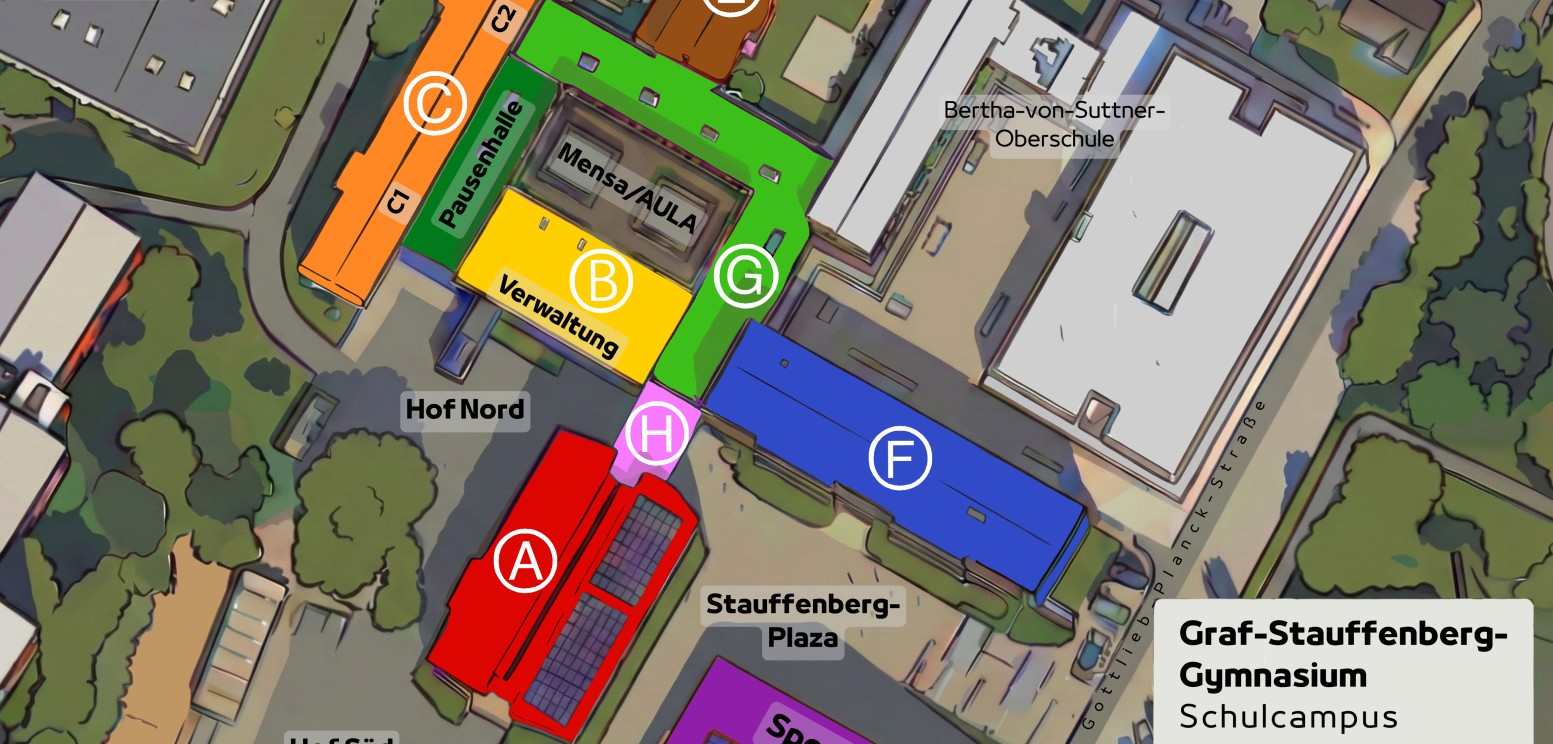 Nach den Osterferien erhalten die Gebäude (und Räume) auf dem GSG-Schulcampus neue Bezeichnungen, welche insgesamt besser nachzuvollziehen sind. In der Zeit bis zu den Sommerferien sollen sich diese neuen Bezeichnungen etablieren und einprägen.